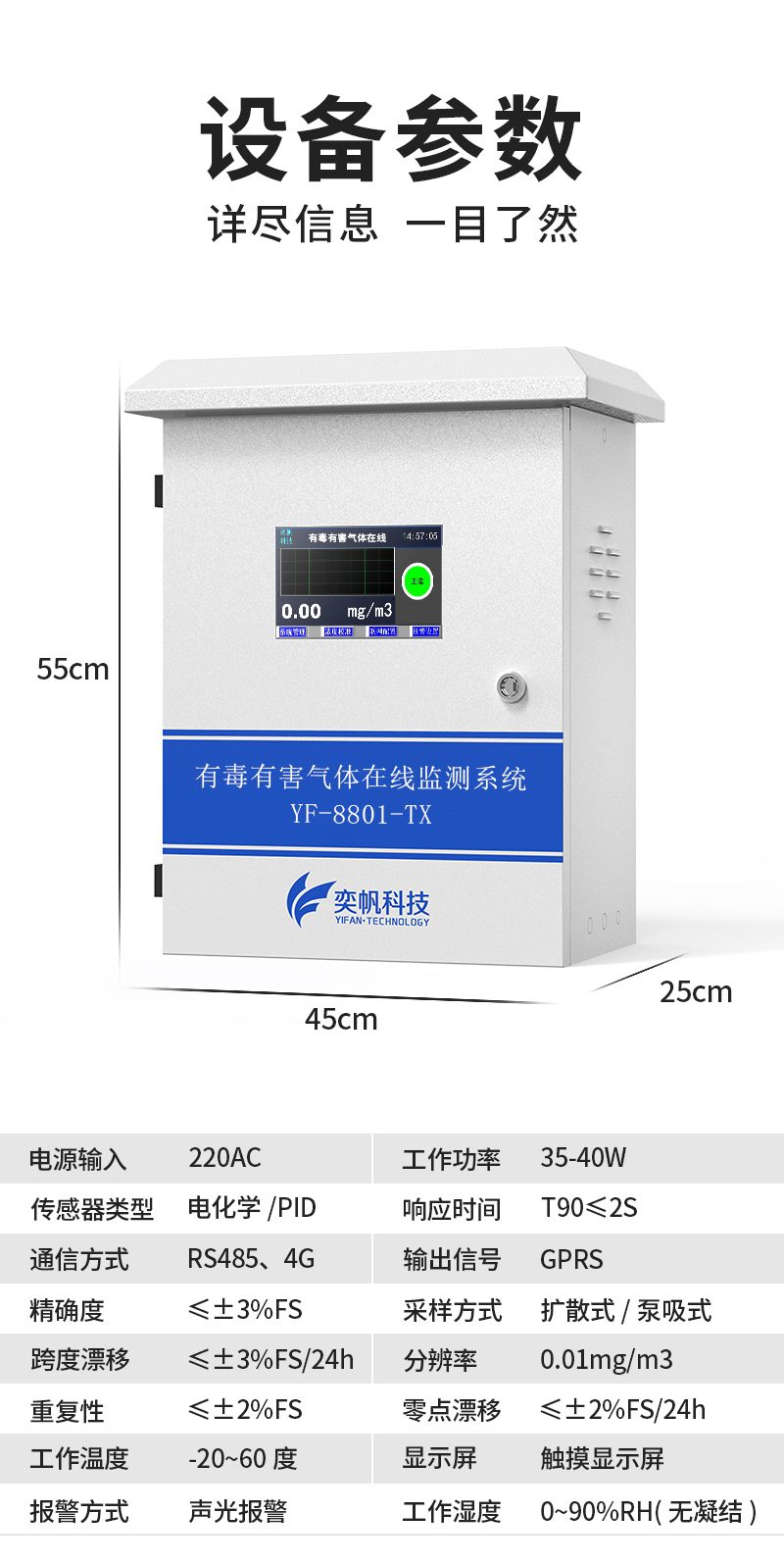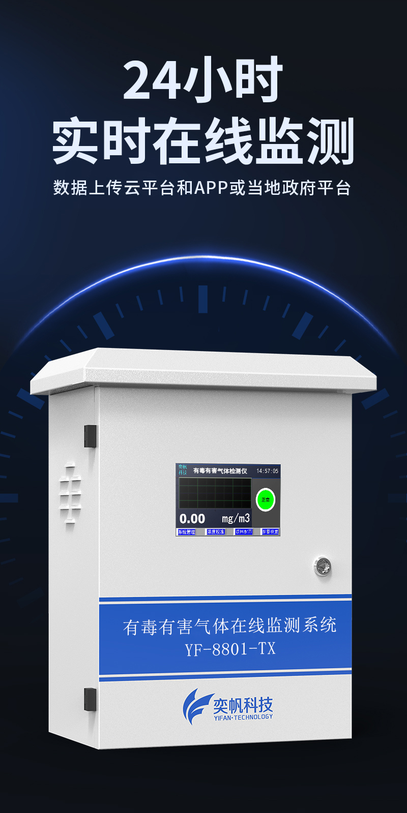 YF-8801-TX有毒有害在線監(jiān)測(cè)系統(tǒng)是我司生產(chǎn)的第三代新型工業(yè)氣體監(jiān)測(cè),可以在線監(jiān)測(cè)多種無(wú)機(jī)因子氣體(例如氨氣、氟化氫、氯化氫、硫化氫、一氧化碳等),具有較高的測(cè)量精度和較寬的動(dòng)態(tài)范圍。支持多種檢測(cè)原理(電化學(xué)、PID等)的氣體探測(cè)器,采用數(shù)字式氣體探測(cè)器,具有對(duì)氣體探測(cè)器自動(dòng)識(shí)別的能力,可靈活變更檢測(cè)因子;具有整機(jī)溫度自動(dòng)調(diào)節(jié)和樣氣濕度自動(dòng)調(diào)節(jié)功能,保障了氣體探測(cè)器靈敏度和穩(wěn)定性??稍赼pp和云平臺(tái)查看實(shí)時(shí)數(shù)據(jù)、歷史數(shù)據(jù)、導(dǎo)出數(shù)據(jù)等,同時(shí)具備24小時(shí)連續(xù)監(jiān)測(cè)、超標(biāo)報(bào)警、數(shù)據(jù)存儲(chǔ)功能