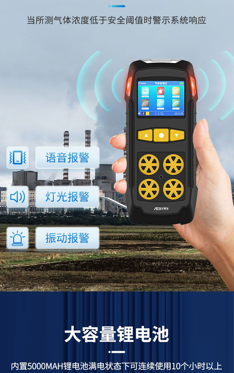 該設(shè)備采用高精度傳感器,響應(yīng)速度快,測(cè)量精度高,穩(wěn)定性強(qiáng)重復(fù)性好,可連續(xù)測(cè)量環(huán)境空氣中的VOC、可燃?xì)怏w有毒有害氣體等氣體。產(chǎn)品采用擴(kuò)散式測(cè)量,內(nèi)置濾網(wǎng),防止大型顆粒物影響傳感器和儀器。配置1.9寸液晶點(diǎn)陣屏幕顯示實(shí)時(shí)濃度,電量。大容量存儲(chǔ)歷史數(shù)據(jù),可存儲(chǔ)十萬(wàn)條歷史記錄,1萬(wàn)條報(bào)警記錄,支持本機(jī)查看。內(nèi)置2000mAH大容量鋰電池,可連續(xù)工作10小時(shí)以上。