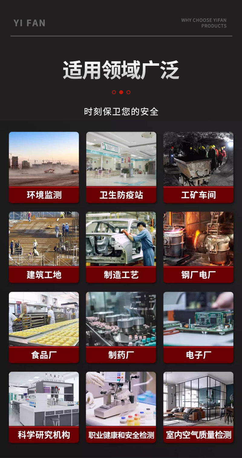 采用泵吸式測量,具備防水,防塵,防震,抗靜電,抗電磁干擾,內(nèi)置水汽、粉塵過濾器,防止因水汽和粉塵損壞傳感器和儀器。配置3.5寸高清液晶彩屏實(shí)時(shí)顯示、5000mAH大容量電池超長待機(jī)、聲光振報(bào)警功能。(兩種款式可選)