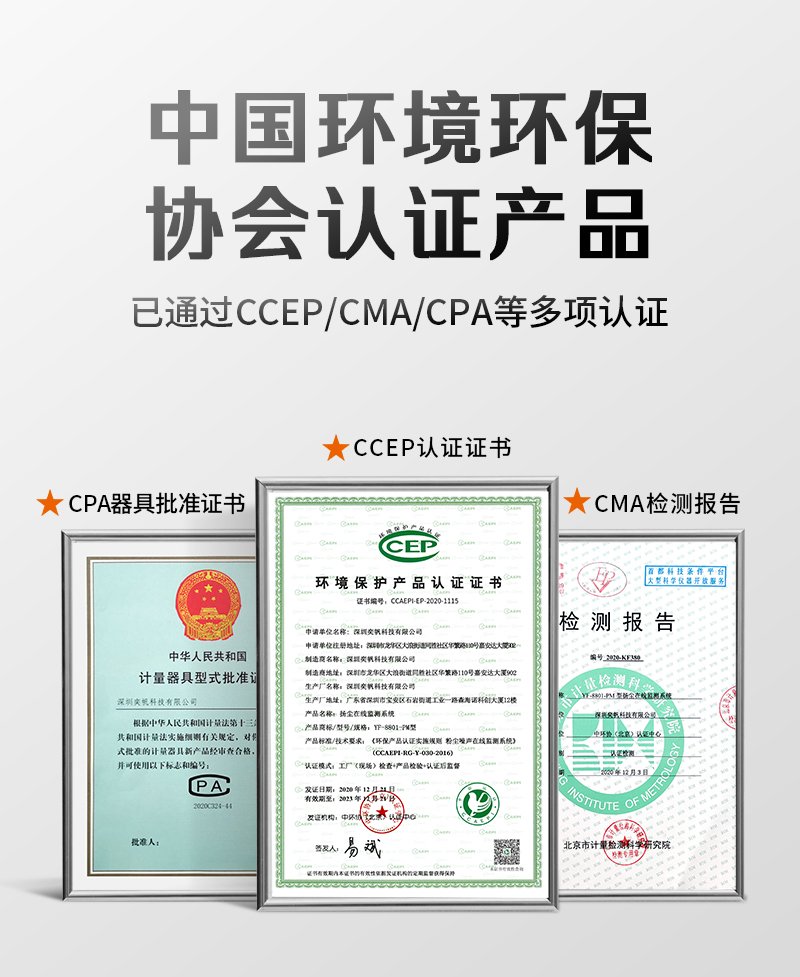 產(chǎn)品資質(zhì)齊全,有CCEP環(huán)保協(xié)會(huì)認(rèn)證、有計(jì)量院CMA檢測報(bào)告 -