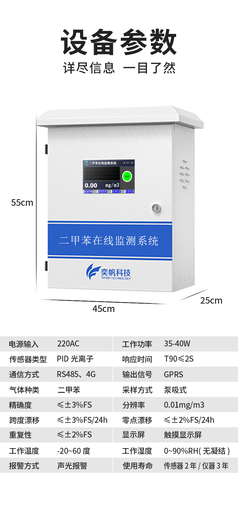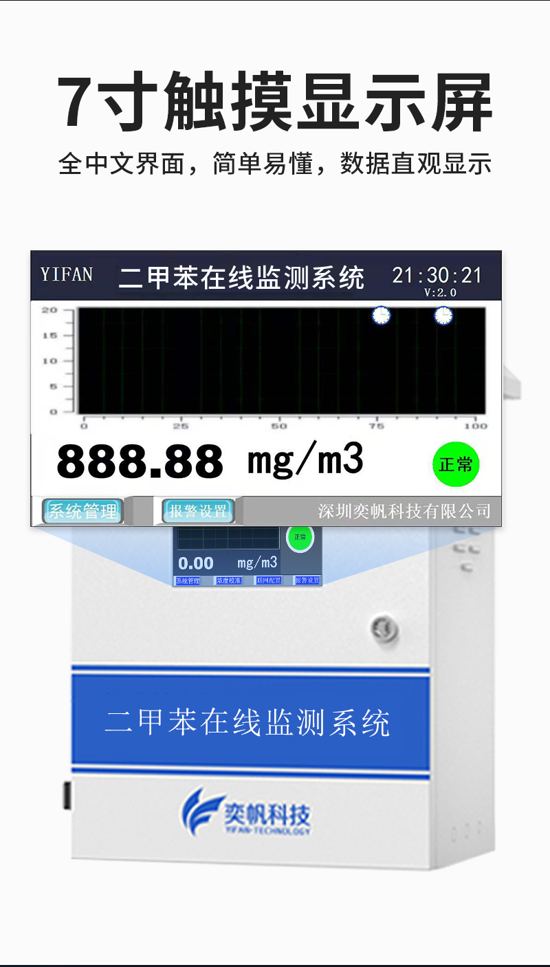 YF-8801-C8H10奕帆科技二甲苯氣體在線監(jiān)測系統(tǒng),適用于連續(xù)監(jiān)測無組織環(huán)境空氣中的非甲烷總烴、苯、甲苯、二甲苯等揮發(fā)性有機物氣體。產(chǎn)品選用進口原裝(baseline)高精度PID光離子傳感器,采用泵吸式采樣監(jiān)測,內(nèi)置多重預(yù)處系統(tǒng),包括除塵冷卻除水過濾等,可以很好的保護傳感器不受侵害,保證監(jiān)測數(shù)據(jù)的準確穩(wěn)定??稍赼pp和云平臺查看實時數(shù)據(jù)、歷史數(shù)據(jù)、導(dǎo)出數(shù)據(jù)等同時具備24小時連續(xù)監(jiān)測、超標報警、數(shù)據(jù)存儲功能。產(chǎn)品已獲得CCEP中國環(huán)境環(huán)保協(xié)會認證、CMA檢測報告:軟件著作權(quán)登記證書。