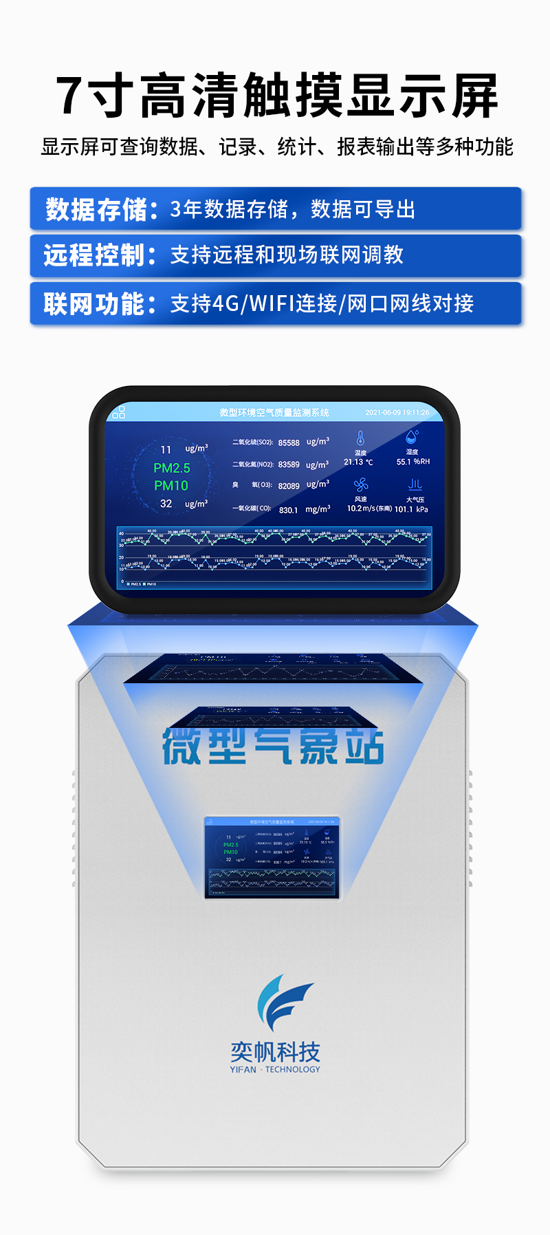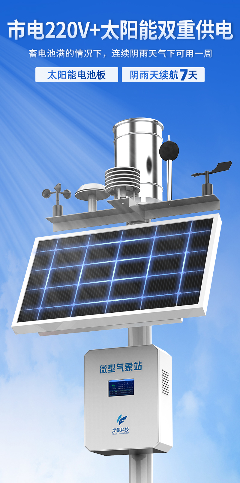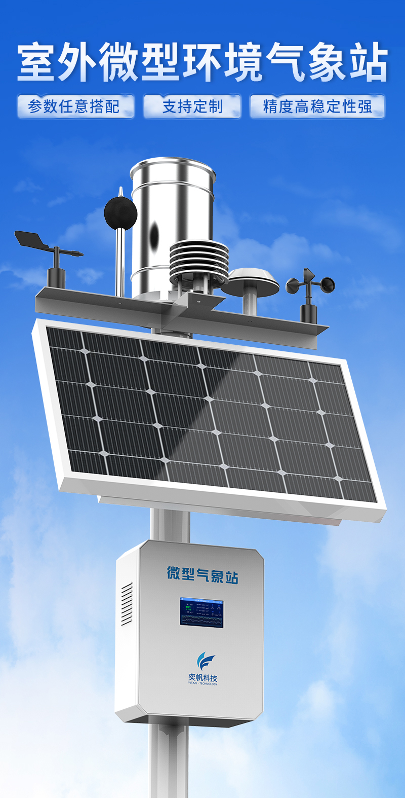 YF-8801-QX奕帆科技微型氣象站是按照國(guó)際氣象觀測(cè)標(biāo)準(zhǔn),研究而開(kāi)發(fā)生產(chǎn)的多要素自動(dòng)觀測(cè)站??杀O(jiān)測(cè)空氣溫度、濕度、風(fēng)向、風(fēng)速、氣壓、雨量、光照強(qiáng)度、總輻射等常規(guī)氣象要素,可在無(wú)人值守的惡劣環(huán)境下全天候全自動(dòng)正常運(yùn)行,可擴(kuò)展對(duì)氣象參數(shù)進(jìn)行監(jiān)測(cè)。同時(shí)結(jié)合物聯(lián)網(wǎng)、智能采集系統(tǒng)、地理信息系統(tǒng)、動(dòng)態(tài)圖表系統(tǒng)等先進(jìn)技術(shù)為環(huán)保部門(mén)的環(huán)境決策、環(huán)境管理、污染防治提供詳實(shí)的數(shù)據(jù)資料和科學(xué)依據(jù)。